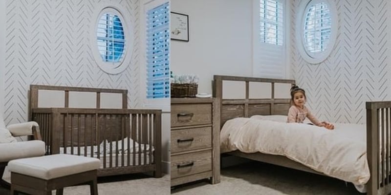 Natart convertible crib in white and wooden panel turned into junior bed and twin bed